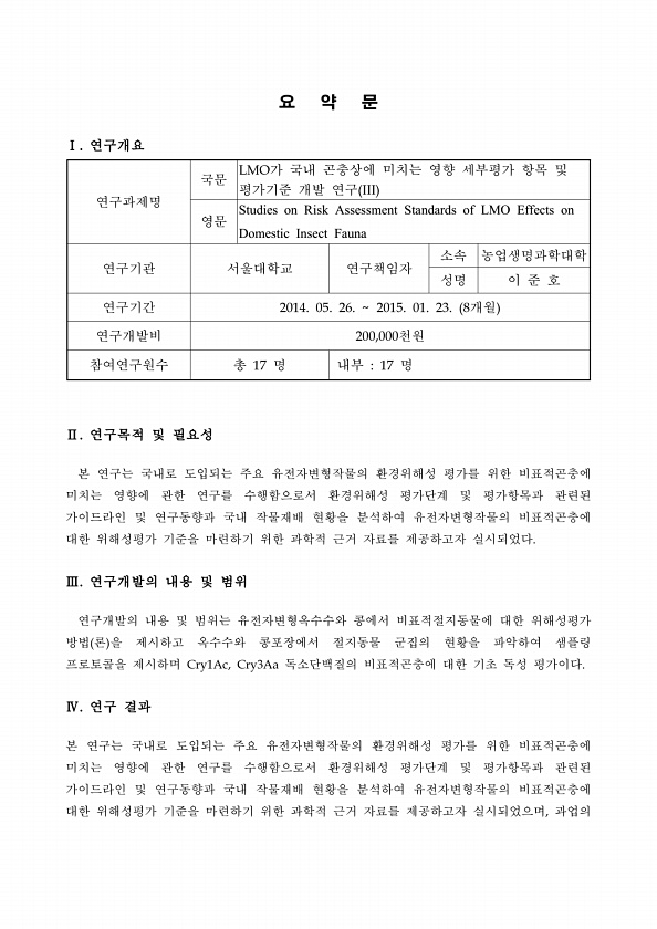 요 약 문 Ⅰ. 연구개요 연구과제명 국문 LMO가 국내 곤충상에 미치는 영향 세부평가 항목 및 평가기준 개발 연구 III 영문 Studies on Risk Assessment Standards of LMO Effects on Domestic Insect Fauna 연구기관 서울대학교 연구책임자 소속 농업생명과학대학 성명 이 준 호 연구기간 2014. 05. 26. 2015. 01. 23. 8개월 연구개발비 200,000천원 참여연구원수 총 17 명 내부 17 명 Ⅱ. 연구목적 및 필요성 본 연구는 국내로 도입되는 주요 유전자변형작물의 환경위해성 평가를 위한 비표적곤충에 미치는 영향에 관한 연구를 수행함으로서 환경위해성 평가단계 및 평가항목과 관련된 가이드라인 및 연구동향과 국내 작물재배 현황을 분석하여 유전...