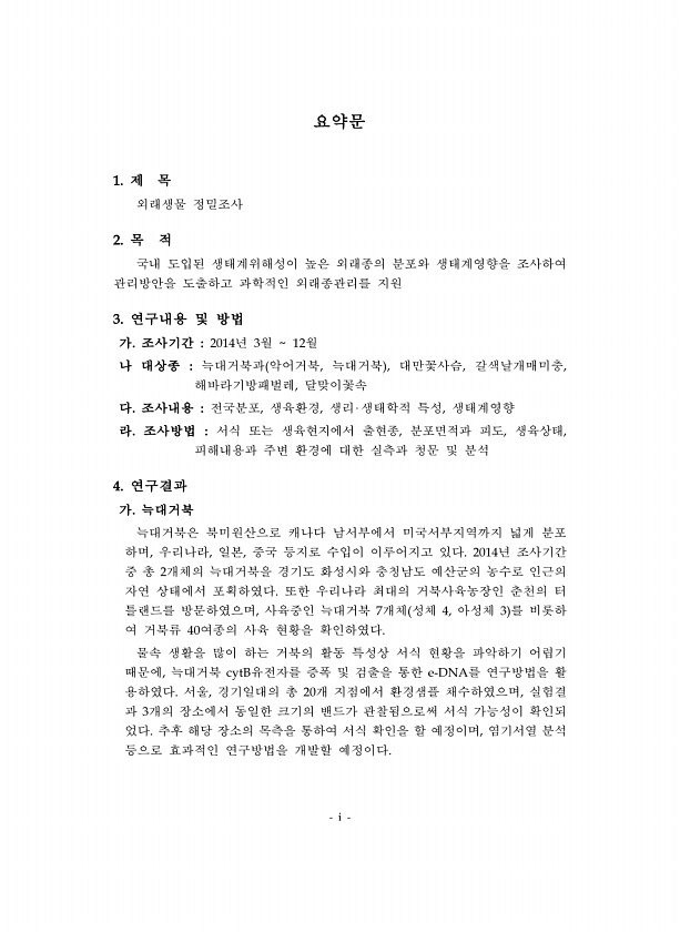 i 요약문 1. 제 목 외래생물 정밀조사 2. 목 적 국내 도입된 생태계위해성이 높은 외래종의 분포와 생태계영향을 조사하여 관리방안을 도출하고 과학적인 외래종관리를 지원 3. 연구내용 및 방법 가. 조사기간 2014년 3월 12월 나 대상종 늑대거북과 악어거북, 늑대거북 , 대만꽃사슴, 갈색날개매미충, 해바라기방패벌레, 달맞이꽃속 다. 조사내용 전국분포, 생육환경, 생리 생태학적 특성, 생태계영향 라. 조사방법 서식 또는 생육현지에서 출현종, 분포면적과 피도, 생육상태, 피해내용과 주변 환경에 대한 실측과 청문 및 분석 4. 연구결과 가. 늑대거북 늑대거북은 북미원산으로 캐나다 남서부에서 미국서부지역까지 넓게 분포 하며, 우리나라, 일본, 중국 등지로 수입이 이루어지고 있다. 2014년 조사기간 중 총 2개...