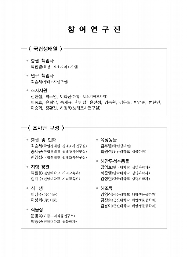 참 여 연 구 진 국립생태원 ? 총괄 책임자 박진영 특정·보호지역조사팀 ? 연구 책임자 최승세 생태조사연구실 ? 조사지원 신현철, 박소연, 이화진 특정·보호지역조사팀 이중효, 윤희남, 송세규, 한영섭, 윤선정, 강동원, 김우열, 박성준, 범현민, 이승혁, 장환진, 하정욱 생태조사연구실 조사단 구성 ? 총괄 및 현황 최승세 국립생태원 생태조사연구실 송세규 국립생태원 생태조사연구실 한영섭 국립생태원 생태조사연구실 ? 지형·경관 박철웅 전남대학교 지리교육과 김지수 전남대학교 지리교육과 ? 식 생 이남주 주 이풀 이상화 주 이풀 ? 식물상 문명옥 아름드리식물연구소 박승진 전북대학교 생물학과 ? 육상동물 김우열 국립생태원 최원석 전남대학교 생물학과 ? 해안무척추동물 김영효 단국대학교 생명과학과 허준행 단국대학교 생명...