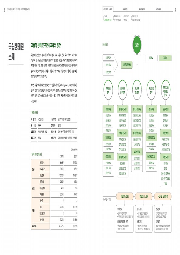 8 2018-2020 제2차 국립생태원 사회적가치경영보고서 국립생태원 STORY SECTIONⅠ SECTIONⅡ APPENDIX 9 주요기능과 역할 국립생태원 고품격 생태 연구전시교육의 공간 소개 국립생태원은 한반도 생태계를 비롯하여 열대, 사막, 지중해, 온대, 극지 등 세계 5대 기후와 그곳에서 서식하는 동식물을 한눈에 관찰하고 체험해 볼 수 있는 고품격 생태연구·전시·교육의 공간입니다. 우리나라와 세계의 생태연구를 선도하여 국가 경쟁력을 높이고, 국민들에게 생태계에 대한 다양한 체험과 배움의 장을 제공함으로써 환경을 보전하고 올바른 환경의식을 함양하는데 기여하고자 합니다. 세계는 지금 생태계의 무분별한 훼손으로 멸종위기종이 급격하게 늘어나고, 기후변화에 따른 생태계 변화가 심각한 수준에 이르렀습니다. ...