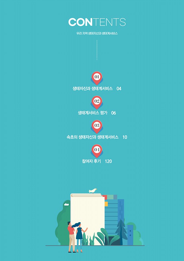 CONTENTS 우리 지역 생태자산과 생태계서비스 01 02 03 04 생태자산과 생태계서비스 04 생태계서비스 평가 06 속초의 생태자산과 생태계서비스 10 참여자 후기120