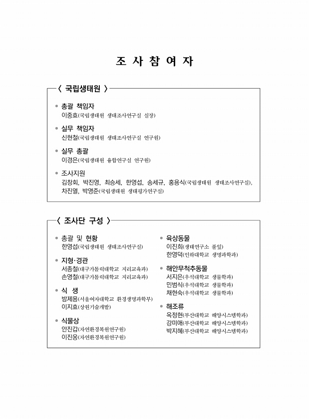 조 사 참 여 자 국립생태원 ? 총괄 책임자 이중효 국립생태원 생태조사연구실 실장 ? 실무 책임자 신현철 국립생태원 생태조사연구실 연구원 ? 실무 총괄 이경은 국립생태원 융합연구실 연구원 ? 조사지원 김창회, 박진영, 최승세, 한영섭, 송세규, 홍용식 국립생태원 생태조사연구실 , 차진열, 박영준 국립생태원 생태평가연구실 조사단 구성 ? 총괄 및 현황 한영섭 국립생태원 생태조사연구실 ? 지형·경관 서종철 대구가톨릭대학교 지리교육과 손영철 대구가톨릭대학교 지리교육과 ? 식 생 방제용 서울여자대학교 환경생명과학부 이지효 상원기술개발 ? 식물상 안진갑 자연환경복원연구원 이진웅 자연환경복원연구원 ? 육상동물 이진희 생태연구소 풀잎 한영덕 인하대학교 생명과학과 ? 해안무척추동물 서지은 우석대학교 생물학과 민범식 우석대...