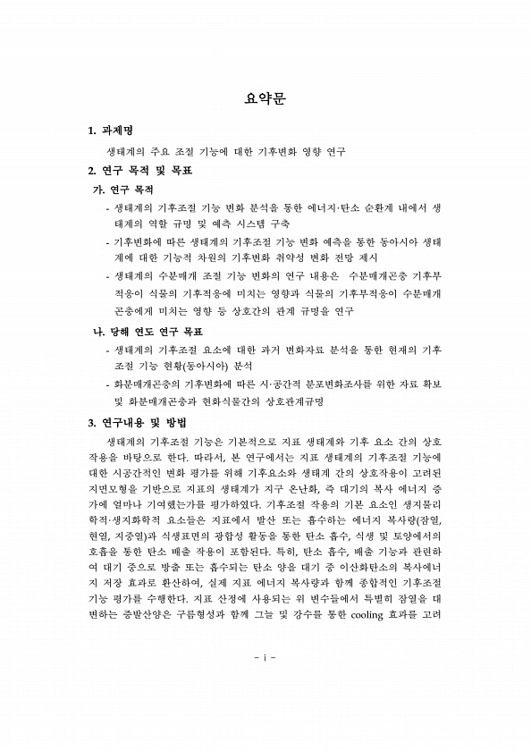 i 요약문 1. 과제명 생태계의 주요 조절 기능에 대한 기후변화 영향 연구 2. 연구 목적 및 목표 가. 연구 목적 생태계의 기후조절 기능 변화 분석을 통한 에너지·탄소 순환계 내에서 생 태계의 역할 규명 및 예측 시스템 구축 기후변화에 따른 생태계의 기후조절 기능 변화 예측을 통한 동아시아 생태 계에 대한 기능적 차원의 기후변화 취약성 변화 전망 제시 생태계의 수분매개 조절 기능 변화의 연구 내용은 수분매개곤충 기후부 적응이 식물의 기후적응에 미치는 영향과 식물의 기후부적응이 수분매개 곤충에게 미치는 영향 등 상호간의 관계 규명을 연구 나. 당해 연도 연구 목표 생태계의 기후조절 요소에 대한 과거 변화자료 분석을 통한 현재의 기후 조절 기능 현황 동아시아 분석 화분매개곤충의 기후변화에 따른 시·공간적 분포...
