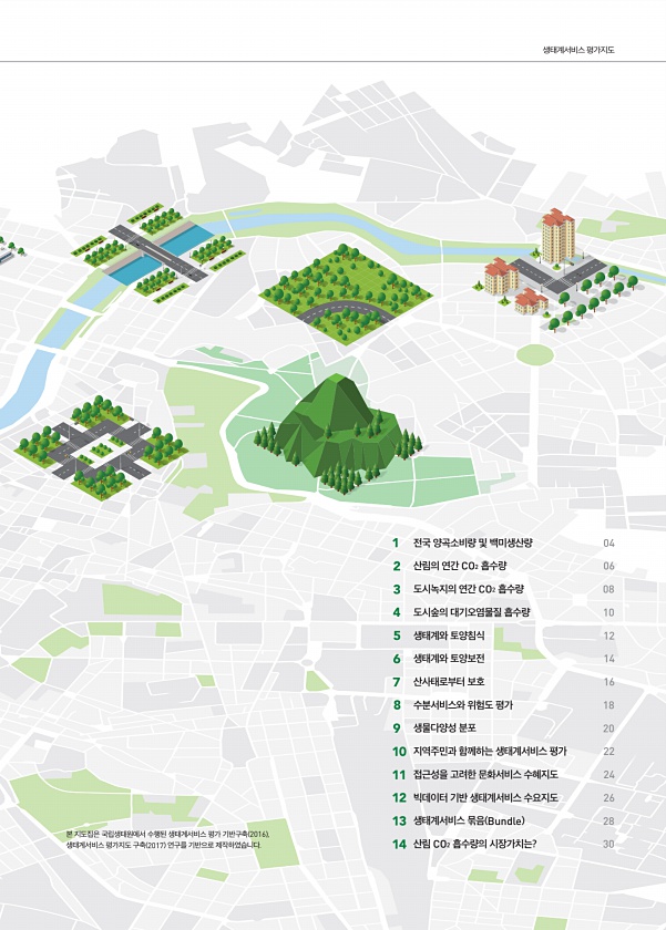 1 전국 양곡소비량 및 백미생산량 04 2 산림의 연간 CO2 흡수량 06 3 도시녹지의 연간 CO2 흡수량 08 4 도시숲의 대기오염물질 흡수량 10 5 생태계와 토양침식 12 6 생태계와 토양보전 14 7 산사태로부터 보호 16 8 수분서비스와 위험도 평가 18 9 생물다양성 분포 20 10 지역주민과 함께하는 생태계서비스 평가 22 11 접근성을 고려한 문화서비스 수혜지도 24 12 빅데이터 기반 생태계서비스 수요지도 26 13 생태계서비스 묶음 Bundle 28 14 산림 CO2 흡수량의 시장가치는? 30 본 지도집은 국립생태원에서 수행된 생태계서비스 평가 기반구축 2016 , 생태계서비스 평가지도 구축 2017 연구를 기반으로 제작하였습니다. 생태계서비스평가지도