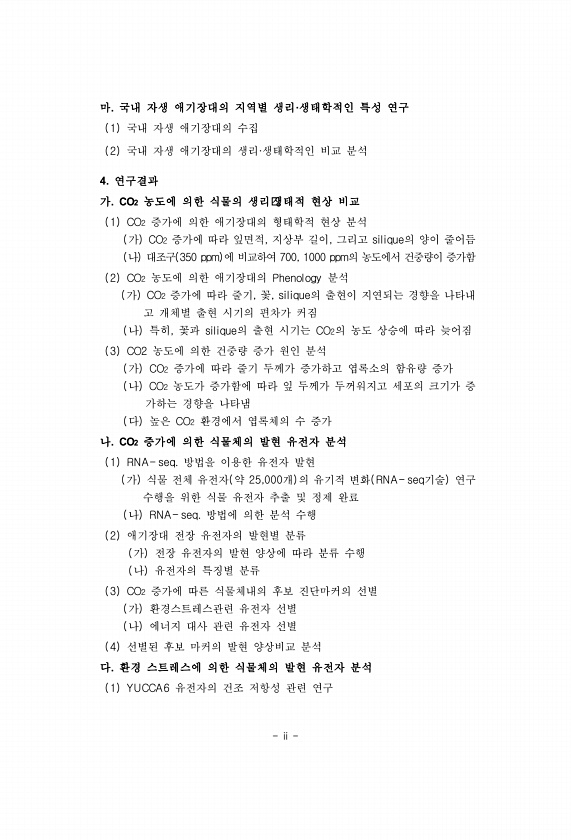 ii 마. 국내 자생 애기장대의 지역별 생리·생태학적인 특성 연구 1 국내 자생 애기장대의 수집 2 국내 자생 애기장대의 생리·생태학적인 비교 분석 4. 연구결과 가. CO2 농도에 의한 식물의 생리 생태적 현상 비교 1 CO2 증가에 의한 애기장대의 형태학적 현상 분석 가 CO2 증가에 따라 잎면적, 지상부 길이, 그리고 silique의 양이 줄어듬 나 대조구 350 ppm 에 비교하여 700, 1000 ppm의 농도에서 건중량이 증가함 2 CO2 농도에 의한 애기장대의 Phenology 분석 가 CO2 증가에 따라 줄기, 꽃, silique의 출현이 지연되는 경향을 나타내 고 개체별 출현 시기의 편차가 커짐 나 특히, 꽃과 silique의 출현 시기는 CO2의 농도 상승에 따라 늦어짐 3 CO2 농도에 ...