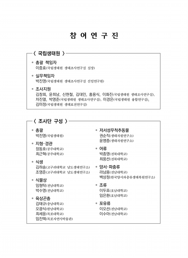참 여 연 구 진 국립생태원 ? 총괄 책임자 이중효 국립생태원 생태조사연구실 실장 ? 실무책임자 박진영 국립생태원 생태조사연구실 선임연구원 ? 조사지원 김창회, 윤희남, 신현철, 김대인, 홍용식, 이화진 국립생태원 생태조사연구실 , 차진열, 박영준 국립생태원 생태조사연구실 , 이경은 국립생태원 융합연구실 , 김미정 국립생태원 생태보전연구실 조사단 구성 ? 총괄 박진영 국립생태원 ? 지형?경관 장동호 공주대학교 최근혁 공주대학교 ? 식생 김하송 고구려대학교 남도생태연구소 조영준 고구려대학교 남도생태연구소 ? 식물상 임형탁 전남대학교 박수영 전남대학교 ? 육상곤충 김태규 충남대학교 오광식 한남대학교 최세웅 목포대학교 임진택 목포자연사박물관 ? 저서성무척추동물 권순직 생태자원연구소 윤명중 생태자원연구소 ? 어류 ...