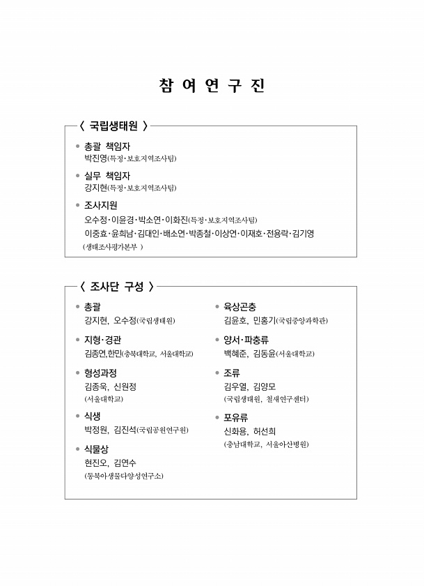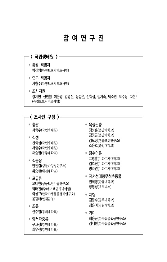 참 여 연 구 진 국립생태원 ? 총괄 책임자 박진영 특정?보호지역조사팀 ? 실무 책임자 강지현 특정?보호지역조사팀 ? 조사지원 오수정?이윤경?박소연?이화진 특정?보호지역조사팀 이중효?윤희남?김대인?배소연?박종철?이상연?이재호?전용락?김기영 생태조사평가본부 조사단 구성 ? 총괄 강지현, 오수정 국립생태원 ? 지형?경관 김종연,한민 충북대학교, 서울대학교 ? 형성과정 김종욱, 신원정 서울대학교 ? 식생 박정원, 김진석 국립공원연구원 ? 식물상 현진오, 김연수 동북아생물다양성연구소 ? 육상곤충 김윤호, 민홍기 국립중앙과학관 ? 양서?파충류 백혜준, 김동윤 서울대학교 ? 조류 김우열, 김양모 국립생태원, 철새연구센터 ? 포유류 신화용, 허선희 충남대학교, 서울아산병원