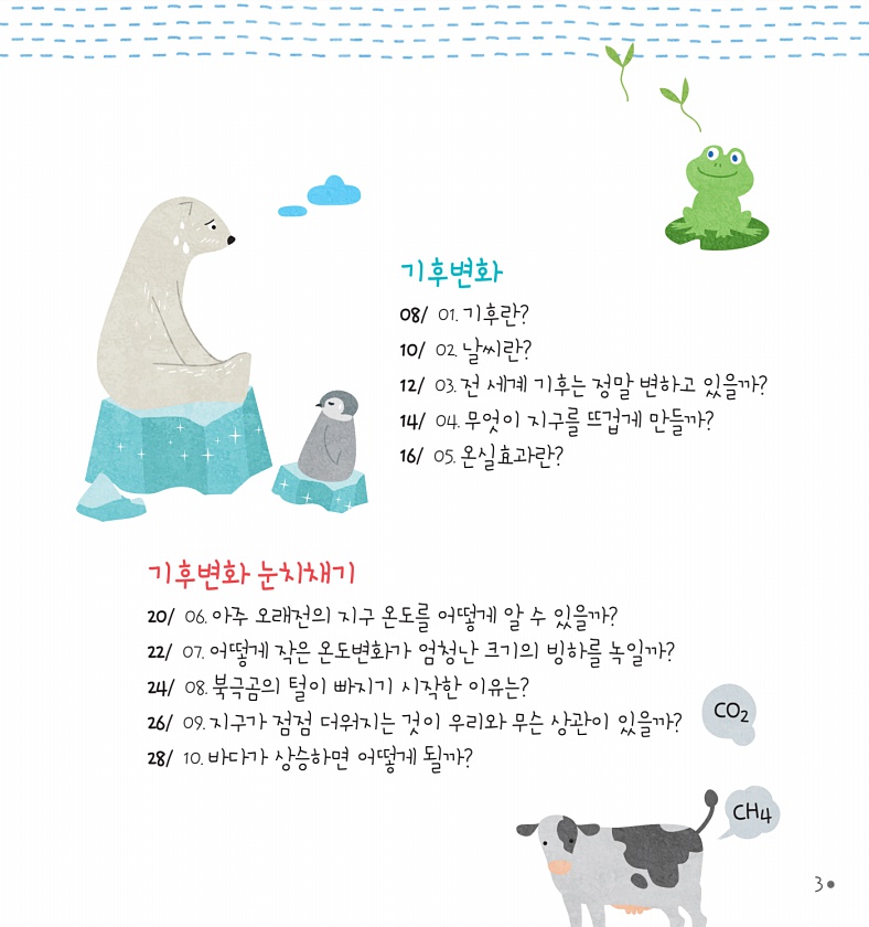3 ● CH4 CO2 기후변화 눈치채기 20/ 06. 아주 오래전의 지구 온도를 어떻게 알 수 있을까? 22/ 07. 어떻게 작은 온도변화가 엄청난 크기의 빙하를 녹일까? 24/ 08. 북극곰의 털이 빠지기 시작한 이유는? 26/ 09. 지구가 점점 더워지는 것이 우리와 무슨 상관이 있을까? 28/ 10. 바다가 상승하면 어떻게 될까? 기후변화 08/ 01. 기후란? 10/ 02. 날씨란? 12/ 03. 전 세계 기후는 정말 변하고 있을까? 14/ 04. 무엇이 지구를 뜨겁게 만들까? 16/ 05.온실효과란?