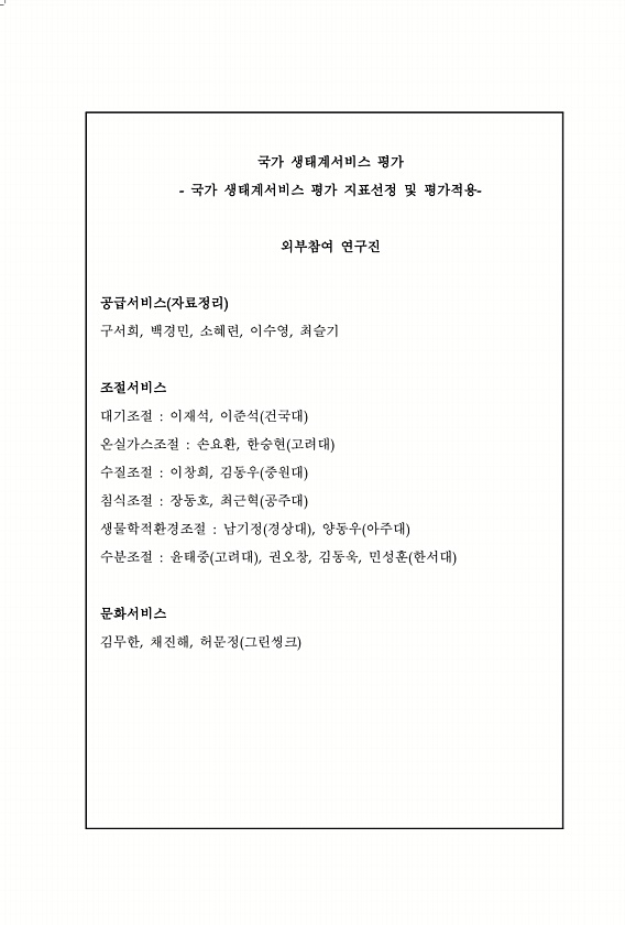 국가 생태계서비스 평가 국가 생태계서비스 평가 지표선정 및 평가적용- 외부참여 연구진 공급서비스 자료정리 구서희, 백경민, 소혜련, 이수영, 최슬기 조절서비스 대기조절 이재석, 이준석 건국대 온실가스조절 손요환, 한승현 고려대 수질조절 이창희, 김동우 중원대 침식조절 장동호, 최근혁 공주대 생물학적환경조절 남기정 경상대 , 양동우 아주대 수분조절 윤태중 고려대 , 권오창, 김동욱, 민성훈 한서대 문화서비스 김무한, 채진해, 허문정 그린씽크
