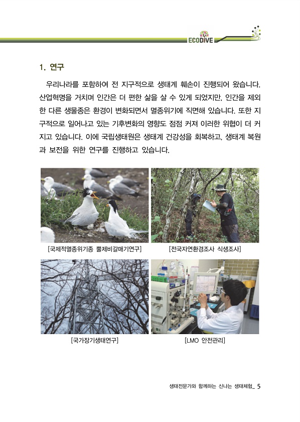 생태전문가와 함께하는 신나는 생태체험_ 5 1. 연구 우리나라를 포함하여 전 지구적으로 생태계 훼손이 진행되어 왔습니다. 산업혁명을 거치며 인간은 더 편한 삶을 살 수 있게 되었지만, 인간을 제외 한 다른 생물종은 환경이 변화되면서 멸종위기에 직면해 있습니다. 또한 지 구적으로 일어나고 있는 기후변화의 영향도 점점 커져 이러한 위협이 더 커 지고 있습니다. 이에 국립생태원은 생태계 건강성을 회복하고, 생태계 복원 과 보전을 위한 연구를 진행하고 있습니다. [국제적멸종위기종 뿔제비갈매기연구] [전국자연환경조사 식생조사] [국가장기생태연구] [LMO안전관리]