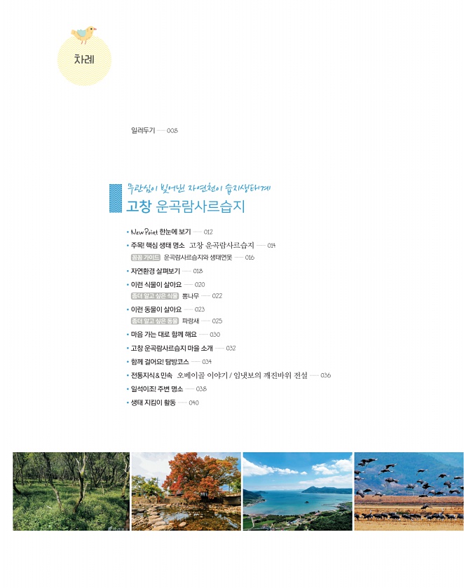 차례 일러두기 008 New Point 한눈에 보기 012 주목! 핵심 생태 명소 고창 운곡람사르습지 014 꼼꼼 가이드 운곡람사르습지와 생태연못 016 자연환경 살펴보기 018 이런 식물이 살아요 020 좀더 알고 싶은 식물 뽕나무 022 이런 동물이 살아요 023 좀더 알고 싶은 동물 파랑새 025 마음 가는 대로 함께 해요 030 고창 운곡람사르습지 마을 소개 032 함께 걸어요! 탐방코스 034 전통지식 & 민속 오베이골 이야기 /임냇보의 깨진바위 전설 036 일석이조! 주변 명소 038 생태 지킴이 활동 040 고창 운곡람사르습지 무관심이 빚어낸 자연천이습지생태계