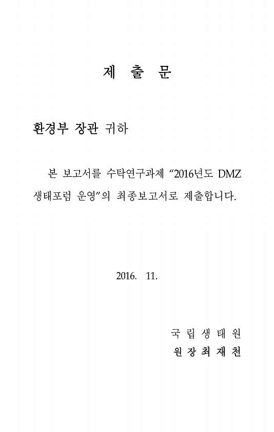 제 출 문 환경부 장관 귀하 본 보고서를 수탁연구과제 “2016년도 DMZ 생태포럼 운영”의 최종보고서로 제출합니다. 2016. 11. 국 립 생 태 원 원 장 최 재천