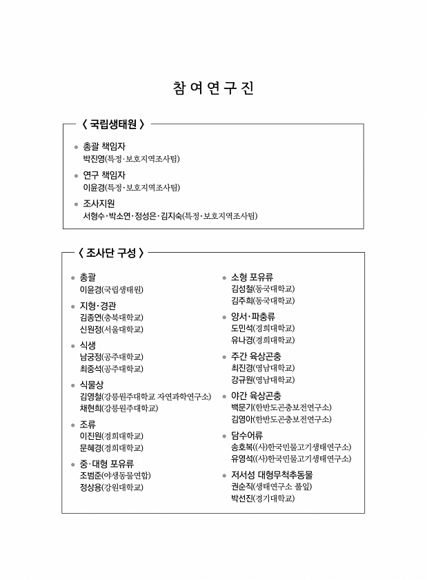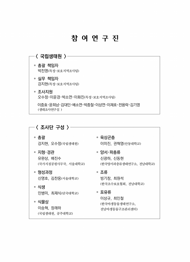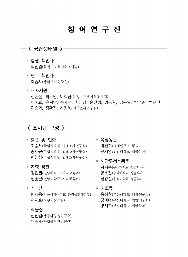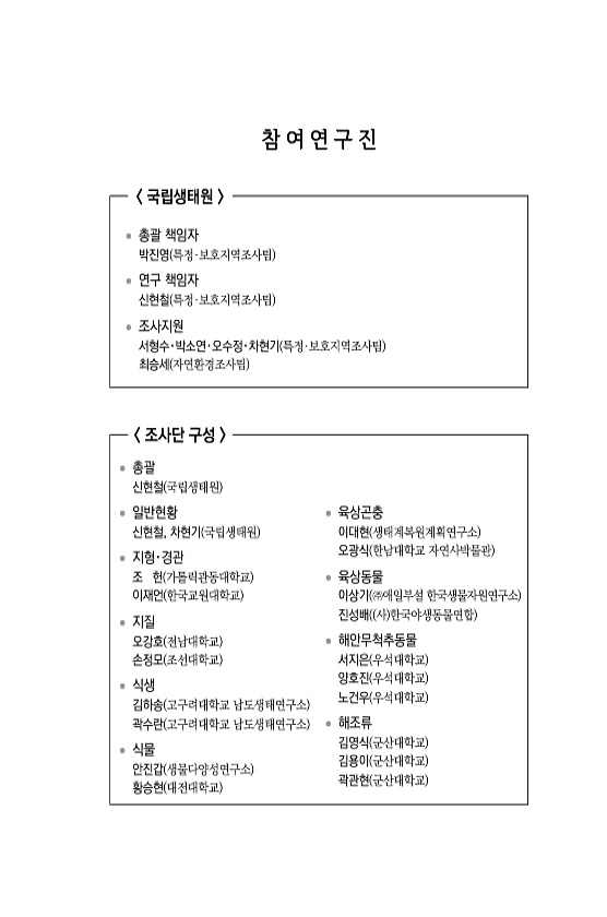 참 여 연 구 진 국립생태원 ? 총괄 책임자 박진영 특정·보호지역조사팀 ? 연구 책임자 신현철 특정·보호지역조사팀 ? 조사지원 서형수?박소연?오수정?차현기 특정·보호지역조사팀 최승세 자연환경조사팀 조사단 구성 ? 총괄 신현철 국립생태원 ? 일반현황 신현철, 차현기 국립생태원 ? 지형?경관 조 헌 가톨릭관동대학교 이재언 한국교원대학교 ? 지질 오강호 전남대학교 손정모 조선대학교 ? 식생 김하송 고구려대학교 남도생태연구소 곽수란 고구려대학교 남도생태연구소 ? 식물 안진갑 생물다양성연구소 황승현 대전대학교 ? 육상곤충 이대현 생태계복원계획연구소 오광식 한남대학교 자연사박물관 ? 육상동물 이상기 ㈜애일부설 한국생물자원연구소 진성배 사 한국야생동물연합 ? 해안무척추동물 서지은 우석대학교 양호진 우석대학교 노건우 우석...
