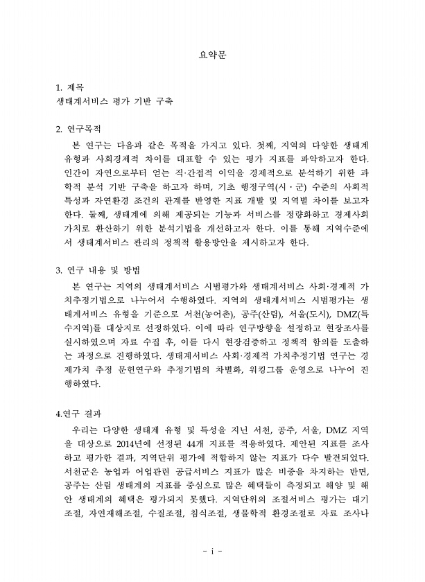 i 요약문 제목 생태계서비스 평가 기반 구축 연구목적 본 연구는 다음과 같은 목적을 가지고 있다 첫째 지역의 다양한 생태계 유형과 사회경제적 차이를 대표할 수 있는 평가 지표를 파악하고자 한다 인간이 자연으로부터 얻는 직 간접적 이익을 경제적으로 분석하기 위한 과 학적 분석 기반 구축을 하고자 하며 기초 행정구역 시 군 수준의 사회적 특성과 자연환경 조건의 관계를 반영한 지표 개발 및 지역별 차이를 보고자 한다 둘째 생태계에 의해 제공되는 기능과 서비스를 정량화하고 경제사회 가치로 환산하기 위한 분석기법을 개선하고자 한다 이를 통해 지역수준에 서 생태계서비스 관리의 정책적 활용방안을 제시하고자 한다 연구 내용 및 방법 본 연구는 지역의 생태계서비스 시범평가와 생태계서비스 사회 경제적 가 치추정기법으로 나누어...