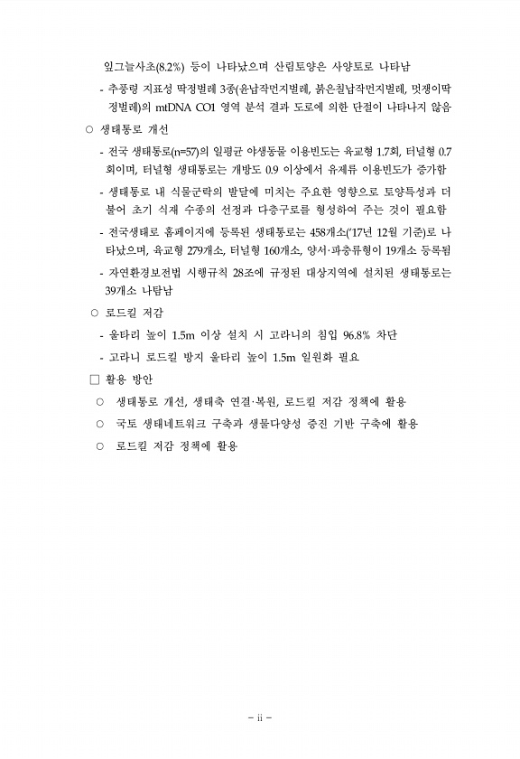 -- ii iii 잎그늘사초 등이 나타났으며 산림토양은 사양토로 나타남 추풍령 지표성 딱정벌레 종 윤납작먼지벌레 붉은칠납작먼지벌레 멋쟁이딱 정벌레 의 영역 분석 결과 도로에 의한 단절이 나타나지 않음 생태통로 개선 전국 생태통로 의 일평균 야생동물 이용빈도는 육교형 회 터널형 회이며 터널형 생태통로는 개방도 이상에서 유제류 이용빈도가 증가함 생태통로 내 식물군락의 발달에 미치는 주요한 영향으로 토양특성과 더 불어 초기 식재 수종의 선정과 다층구로를 형성하여 주는 것이 필요함 전국생태로 홈페이지에 등록된 생태통로는 개소 년 월 기준 로 나 타났으며 육교형 개소 터널형 개소 양서 파충류형이 개소 등록됨 자연환경보전법 시행규칙 조에 규정된 대상지역에 설치된 생태통로는 개소 나탐남 로드킬 저감 울타리 높이 이상 설...