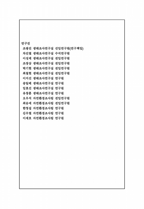 연구진 조광진 생태조사연구실 선임연구원 연구책임 차진열 생태조사연구실 수석연구원 이성제 생태조사연구실 전임연구원 조장삼 생태조사연구실 전임연구원 박기현 생태조사연구실 전임연구원 최철현 생태조사연구실 전임연구원 이지선 생태조사연구실 연구원 송일배 생태조사연구실 연구원 임효선 생태조사연구실 연구원 유창훈 생태조사연구실 연구원 오우석 자연환경조사팀 전임연구원 최승세 자연환경조사팀 전임연구원 한영섭 자연환경조사팀 연구원 김우열 자연환경조사팀 연구원 이재호 자연환경조사팀연구원