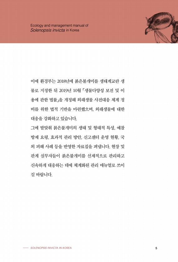 이에 환경부는 2018년에 붉은불개미를 생태계교란 생 물로 지정한 뒤 2019년 10월 「생물다양성 보전 및 이 용에 관한 법률」을 개정해 외래생물 사전대응 체계 정 비를 위한 법적 기반을 마련했으며, 외래생물에 대한 대응을 강화하고 있습니다. 그에 발맞춰 붉은불개미의 생태 및 형태적 특성, 예찰 방제 요령, 효과적 관리 방안, 신고센터 운영 현황, 국 외 피해 사례 등을 반영한 자료집을 펴냅니다. 현장 및 관계 실무자들이 붉은불개미를 선제적으로 관리하고 신속하게 대응하는 데에 체계화된 관리 매뉴얼로 쓰이 길 바랍니다. Ecology and management manual of Solenopsis invicta in Korea SOLENOPSIS INVICTA IN KOREA5