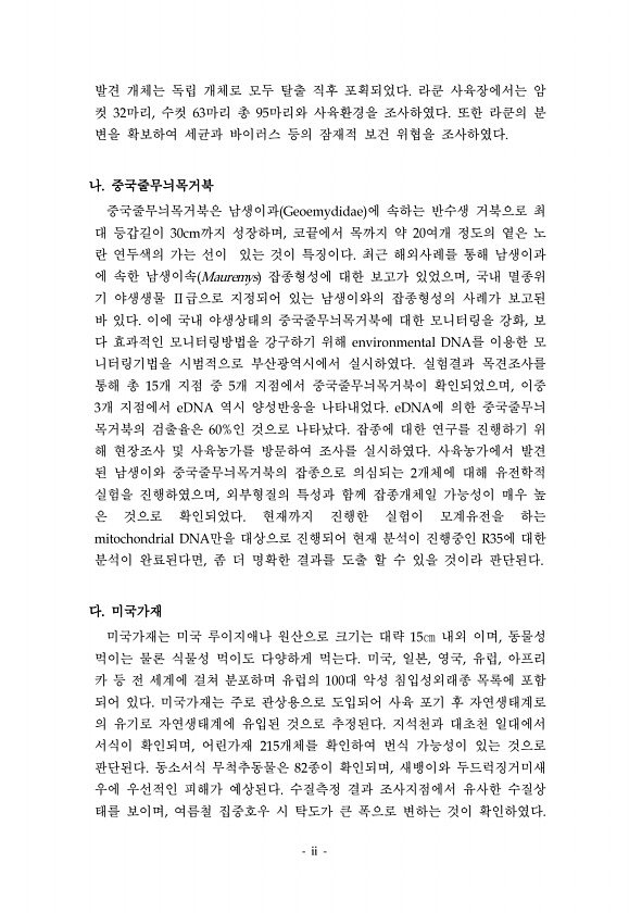 ii 발견 개체는 독립 개체로 모두 탈출 직후 포획되었다. 라쿤 사육장에서는 암 컷 32마리, 수컷 63마리 총 95마리와 사육환경을 조사하였다. 또한 라쿤의 분 변을 확보하여 세균과 바이러스 등의 잠재적 보건 위협을 조사하였다. 나. 중국줄무늬목거북 중국줄무늬목거북은 남생이과 Geoemydidae 에 속하는 반수생 거북으로 최 대 등갑길이 30cm까지 성장하며, 코끝에서 목까지 약 20여개 정도의 옅은 노 란 연두색의 가는 선이 있는 것이 특징이다. 최근 해외사례를 통해 남생이과 에 속한 남생이속 Mauremys 잡종형성에 대한 보고가 있었으며, 국내 멸종위 기 야생생물 Ⅱ급으로 지정되어 있는 남생이와의 잡종형성의 사례가 보고된 바 있다. 이에 국내 야생상태의 중국줄무늬목거북에 대한 모니터링을 강화, 보 ...