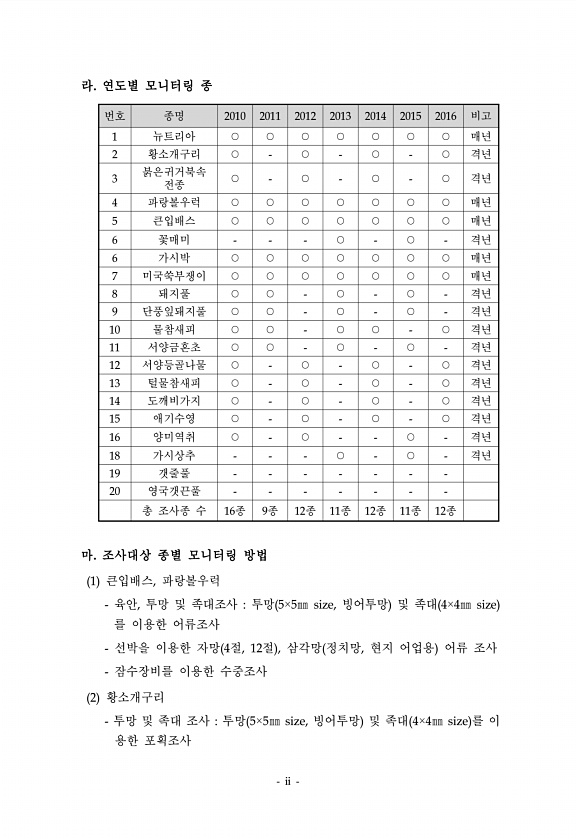 ii 라. 연도별 모니터링 종 번호 종명 2010 2011 2012 2013 2014 2015 2016 비고 1 뉴트리아 ○ ○ ○ ○ ○ ○ ○ 매년 2 황소개구리 ○ ○ ○ ○ 격년 3 붉은귀거북속 전종 ○ ○ ○ ○ 격년 4 파랑볼우럭 ○ ○ ○ ○ ○ ○ ○ 매년 5 큰입배스 ○ ○ ○ ○ ○ ○ ○ 매년 6 꽃매미 ○ ○ 격년 6 가시박 ○ ○ ○ ○ ○ ○ ○ 매년 7 미국쑥부쟁이 ○ ○ ○ ○ ○ ○ ○ 매년 8 돼지풀 ○ ○ ○ ○ 격년 9 단풍잎돼지풀 ○ ○ ○ ○ 격년 10 물참새피 ○ ○ ○ ○ ○ 격년 11 서양금혼초 ○ ○ ○ ○ 격년 12 서양등골나물 ○ ○ ○ ○ 격년 13 털물참새피 ○ ○ ○ ○ 격년 14 도깨비가지 ○ ○ ○ ○ 격년 15 애기수영 ○ ○ ○ ○ 격년 16 양...