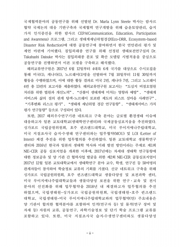 ii 국제협력분야의 공동연구를 위해 선발된 Dr. Marla Lynn Steele 박사는 람사르 협약 국제논의 대응 기반구축과 국제협력 연구개발을 위해 습윤토양관리, 습지 가치 인식증진을 위한 람사르 CEPA Communication, Educatiion, Participation and Awareness 프로그램, 그리고 생태계재난위험경감 Eco-DRR, Ecosystem-based Disaster Risk Reduction 에 대한 공동연구에 참여하면서 한국 연안관리 평가 및 제언 마련에 기여했다. 침입외래종 연구를 위해 선정된 생태보전연구실의 Dr. Takahashi Daisuke 박사는 침입외래종 분포 및 확산 모델링 시범적용을 중심으로 공동연구를 진행하면서 이론 모델을 구축하고 해석했다. 해외교류연...