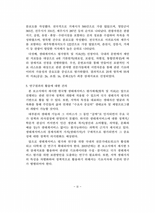 iii 분포도를 작성했다 전국적으로 거제시가 건으로 가장 많았으며 영암군이 건 진주시가 건 제주시가 건 등의 순서로 나타났다 관광자원은 관광 지구 공원 유원 휴양 수련시설을 포함하는 곳의 정보를 수집하여 목록을 작 성하였으며 항목별 건수로 분포도를 작성했다 전국적으로 서귀포시와 제주시 를 포함하는 제주특별자치도가 건으로 가장 많았으며 춘천시 강릉시 거제 시 등 관광이 발달한 지자체가 높은 순위로 나타났다 다섯째 생태계서비스 평가항목 및 지표 안 선정이다 국내외 문헌에서 제안 된 지표들을 대상으로 대 기본원칙 대표성 포괄성 차별성 통합연계성 에 따 라 잠재지표 선정을 진행하였다 우선 문헌조사를 통해 만들어진 포괄적인 지 표 리스트를 대상으로 관련 분야별 전문가들에게 서면자문을 통해 관련 기초데 이터의 가용성과...
