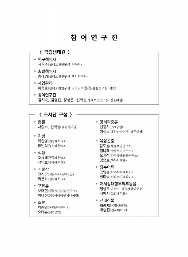 참 여 연 구 진 국립생태원 ? 연구책임자 서형수 생태보전연구실 연구원 ? 총괄책임자 최태영 생태보전연구실 책임연구원 ? 사업관리 이중효 생태보전연구실 실장 , 박은진 융합연구실 실장 ? 참여연구진 김지숙, 김영진, 정성은, 신학섭 생태보전연구실 전문위원 조사단 구성 ? 총괄 서형수, 신학섭 국립생태원 ? 지형 탁한명 전남대학교 허민석 부산대학교 ? 식생 조규태 공주대학교 정영호 공주대학교 ? 식물상 안진갑 생물다양성연구소 라은화 전북대학교 ? 포유류 오대현 생물보전기술연구소 박태진 주 메이텍엔지니어링 ? 조류 백충열 국립습지센터 오태훈 주 삼안 ? 양서파충류 신광하 주 상원 이정옥 대한산악연맹 광주연맹 ? 육상곤충 김도성 생물보전연구소 김나래 생물보전연구소 오기석 한국유용곤충연구소 강승호 싸아이에프 ? 담...