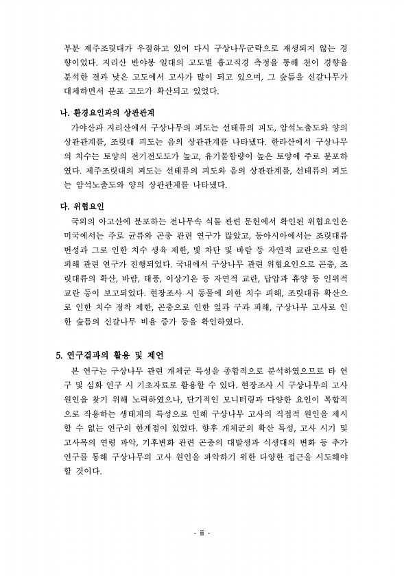 ii 부분 제주조릿대가 우점하고 있어 다시 구상나무군락으로 재생되지 않는 경 향이었다. 지리산 반야봉 일대의 고도별 흉고직경 측정을 통해 천이 경향을 분석한 결과 낮은 고도에서 고사가 많이 되고 있으며, 그 숲틈을 신갈나무가 대체하면서 분포 고도가 확산되고 있었다. 나. 환경요인과의 상관관계 가야산과 지리산에서 구상나무의 피도는 선태류의 피도, 암석노출도와 양의 상관관계를, 조릿대 피도는 음의 상관관계를 나타냈다. 한라산에서 구상나무 의 치수는 토양의 전기전도도가 높고, 유기물함량이 높은 토양에 주로 분포하 였다. 제주조릿대의 피도는 선태류의 피도와 음의 상관관계를, 선태류의 피도 는 암석노출도와 양의 상관관계를 나타냈다. 다. 위협요인 국외의 아고산에 분포하는 전나무속 식물 관련 문헌에서 확인된 위협요인은...