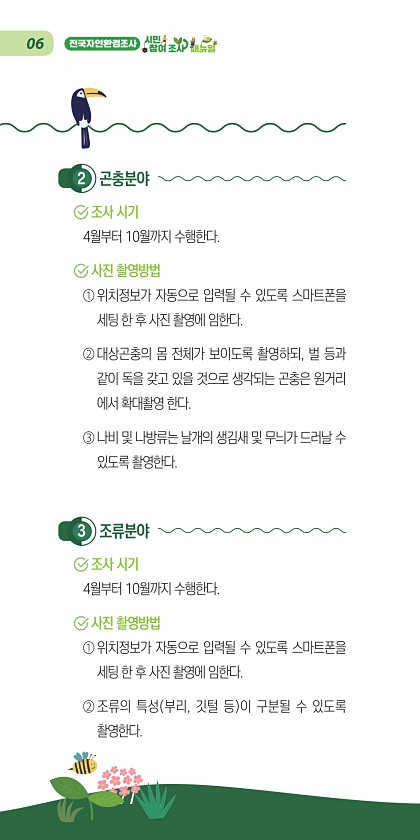 06 2 곤충분야 조사 시기 4월부터 10월까지 수행한다. 사진 촬영방법 ① 위치정보가 자동으로 입력될 수 있도록 스마트폰을 세팅 한 후 사진 촬영에 임한다. ② 대상곤충의 몸 전체가 보이도록 촬영하되, 벌 등과 같이 독을 갖고 있을 것으로 생각되는 곤충은 원거리 에서 확대촬영 한다. ③ 나비 및 나방류는 날개의 생김새 및 무늬가 드러날 수 있도록 촬영한다. 3 조류분야 조사 시기 4월부터 10월까지 수행한다. 사진 촬영방법 ① 위치정보가 자동으로 입력될 수 있도록 스마트폰을 세팅 한 후 사진 촬영에 임한다. ② 조류의 특성 부리, 깃털 등 이 구분될 수 있도록촬영한다.