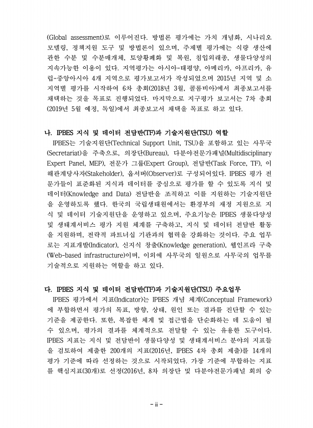 ii Global assessment 로 이루어진다. 방법론 평가에는 가치 개념화, 시나리오 모델링, 정책지원 도구 및 방법론이 있으며, 주제별 평가에는 식량 생산에 관한 수분 및 수분매개체, 토양황폐화 및 복원, 침입외래종, 생물다양성의 지속가능한 이용이 있다. 지역평가는 아시아-태평양, 아메리카, 아프리카, 유 럽-중앙아시아 4개 지역으로 평가보고서가 작성되었으며 2015년 지역 및 소 지역별 평가를 시작하여 6차 총회 2018년 3월, 콜롬비아 에서 최종보고서를 채택하는 것을 목표로 진행되었다. 마지막으로 지구평가 보고서는 7차 총회 2019년 5월 예정, 독일 에서 최종보고서 채택을 목표로 하고 있다. 나. IPBES 지식 및 데이터 전담반 TF 과 기술지원단 TSU 역할 IPBES는 기술지원단 Te...