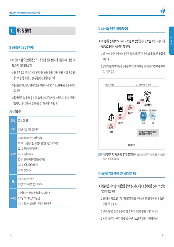 1.1. 배경 및 필요성 가. 국립생태원 설립 및 운영현황 ▶ 2013년에 개원한 국립생태원은 연구, 교육, 전시를 통해 생태가치를 전달하고자 조성된 국내 최초의 생태 전문 기관으로 발전 ?? 생태 연구, 교육, 전시를 통하여, 국민들에게 생태계에 대한 다양한 체험과 배움의 장을 제공? 함으로써 환경을 보전하고, 올바른 환경의식을 함양하는데 기여 ?? 에코리움은 열대, 사막, 지중해 및 온대 바이옴의 주요 구성 식물 4,000여 종을 전시·보전하고 있는 공간 ?? 국립생태원은 지리적 여건 등 환경적 불리함 속에도 2014년 이후 매년 90만 명 정도의 관람객이 방문하여, 국내의 생태교육, 전시 부분을 선도하는 기관으로 위상 제고 [표1] 국립생태원 개요 설립일 2013년10월 28일 소재지 충청남도 서천군 ...