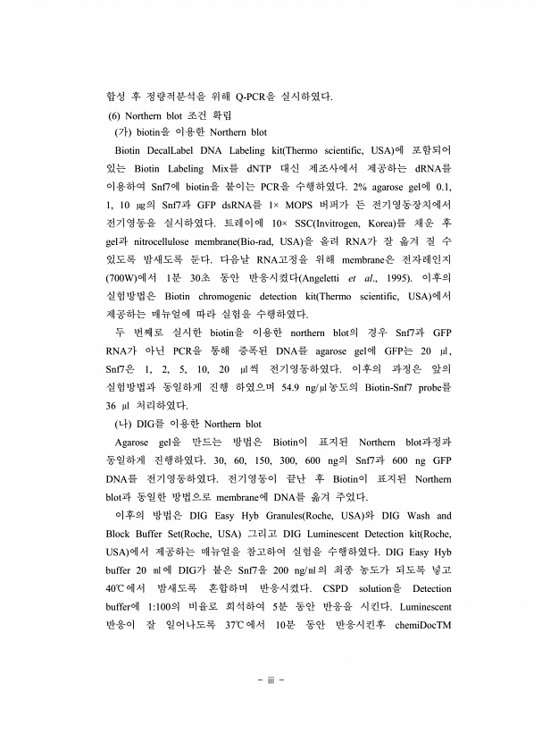 iii 합성 후 정량적분석을 위해 Q-PCR을 실시하였다. 6 Northern blot 조건 확립 가 biotin을 이용한 Northern blot Biotin DecalLabel DNA Labeling kit Thermo scientific, USA 에 포함되어 있는 Biotin Labeling Mix를 dNTP 대신 제조사에서 제공하는 dRNA를 이용하여 Snf7에 biotin을 붙이는 PCR을 수행하였다. 2% agarose gel에 0.1, 1, 10 ㎍의 Snf7과 GFP dsRNA를 1× MOPS 버퍼가 든 전기영동장치에서 전기영동을 실시하였다. 트레이에 10× SSC Invitrogen, Korea 를 채운 후 gel과 nitrocellulose membrane Bio-rad, USA 을 올려 ...