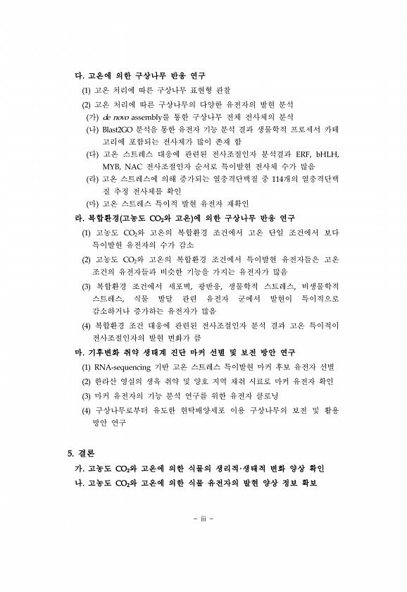 iii 다. 고온에 의한 구상나무 반응 연구 1 고온 처리에 따른 구상나무 표현형 관찰 2 고온 처리에 따른 구상나무의 다양한 유전자의 발현 분석 가 de novo assembly를 통한 구상나무 전체 전사체의 분석 나 Blast2GO 분석을 통한 유전자 기능 분석 결과 생물학적 프로세서 카테 고리에 포함되는 전사체가 많이 존재 함 다 고온 스트레스 대응에 관련된 전사조절인자 분석결과 ERF, bHLH, MYB, NAC 전사조절인자 순서로 특이발현 전사체 수가 많음 라 고온 스트레스에 의해 증가되는 열충격단백질 중 114개의 열충격단백 질 추정 전사체를 확인 마 고온 스트레스 특이적 발현 유전자 재확인 라. 복합환경 고농도 CO2와 고온 에 의한 구상나무 반응 연구 1 고농도 CO2와 고온의 복합환경 조건에...