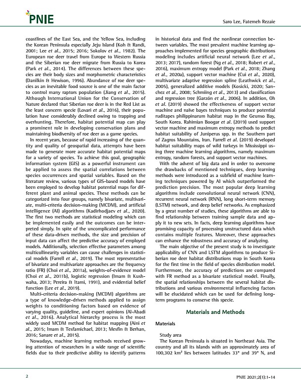 Saro Lee, Fatemeh Rezaie 2 PNIE 2021;2 1 1-14 coastlines of the East Sea, and the Yellow Sea, including the Korean Peninsula especially Jeju Island Koh & Randi, 2001; Lee et al., 2015; 2016; Sokolov et al., 1982 The European roe deer travel from Europe to Western Russia and the Siberian roe deer migrate from Russia to Korea Park et al., 2014 The differences between these species are their body siz...