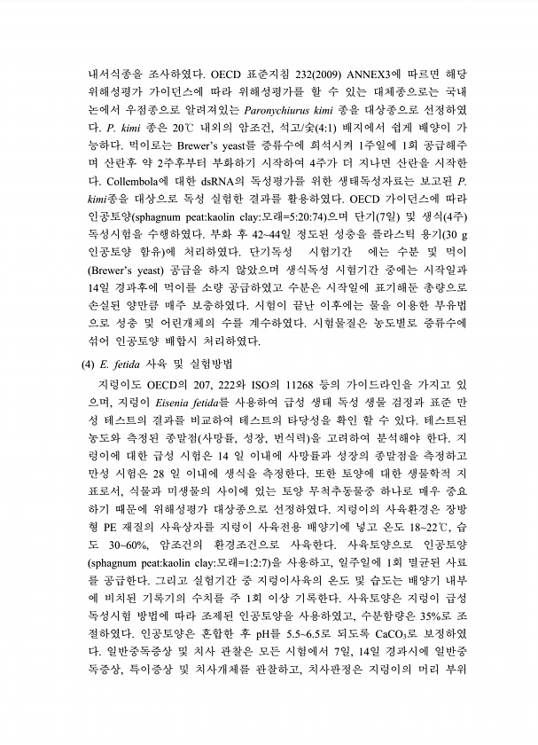 내서식종을 조사하였다. OECD 표준지침 232 2009 ANNEX3에 따르면 해당 위해성평가 가이던스에 따라 위해성평가를 할 수 있는 대체종으로는 국내 논에서 우점종으로 알려져있는 Paronychiurus kimi 종을 대상종으로 선정하였 다. P. kimi 종은 20℃ 내외의 암조건, 석고/숯 41 배지에서 쉽게 배양이 가 능하다. 먹이로는 Brewer’s yeast를 증류수에 희석시켜 1주일에 1회 공급해주 며 산란후 약 2주후부터 부화하기 시작하여 4주가 더 지나면 산란을 시작한 다. Collembola에 대한 dsRNA의 독성평가를 위한 생태독성자료는 보고된 P. kimi종을 대상으로 독성 실험한 결과를 활용하였다. OECD 가이던스에 따라 인공토양 sphagnum peatkaolin clay모래=...
