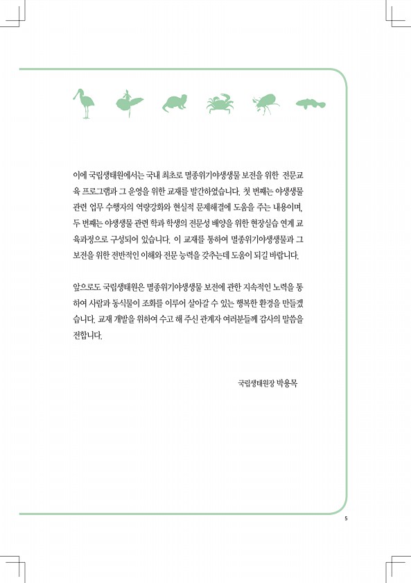 5 이에 국립생태원에서는 국내 최초로 멸종위기야생생물 보전을 위한 전문교 육 프로그램과 그 운영을 위한 교재를 발간하였습니다. 첫 번째는 야생생물 관련 업무 수행자의 역량강화와 현실적 문제해결에 도움을 주는 내용이며, 두 번째는 야생생물 관련 학과 학생의 전문성 배양을 위한 현장실습 연계 교 육과정으로 구성되어 있습니다. 이 교재를 통하여 멸종위기야생생물과 그 보전을 위한 전반적인 이해와 전문 능력을 갖추는데 도움이 되길 바랍니다. 앞으로도 국립생태원은 멸종위기야생생물 보전에 관한 지속적인 노력을 통 하여 사람과 동식물이 조화를 이루어 살아갈 수 있는 행복한 환경을 만들겠 습니다. 교재 개발을 위하여 수고 해 주신 관계자 여러분들께 감사의 말씀을 전합니다. 국립생태원장박용목