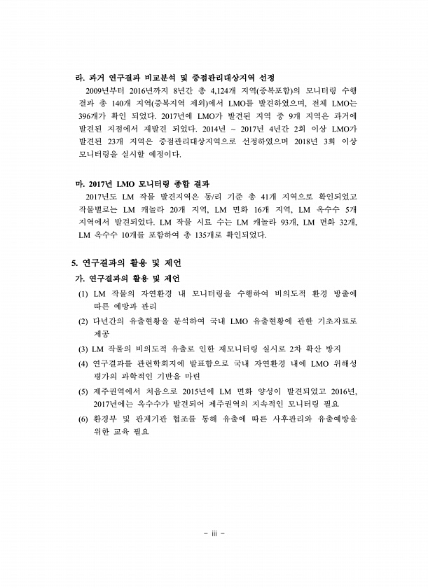 iii 라. 과거 연구결과 비교분석 및 중점관리대상지역 선정 2009년부터 2016년까지 8년간 총 4,124개 지역 중복포함 의 모니터링 수행 결과 총 140개 지역 중복지역 제외 에서 LMO를 발견하였으며, 전체 LMO는 396개가 확인 되었다. 2017년에 LMO가 발견된 지역 중 9개 지역은 과거에 발견된 지점에서 재발견 되었다. 2014년 2017년 4년간 2회 이상 LMO가 발견된 23개 지역은 중점관리대상지역으로 선정하였으며 2018년 3회 이상 모니터링을 실시할 예정이다. 마. 2017년 LMO 모니터링 종합 결과 2017년도 LM 작물 발견지역은 동/리 기준 총 41개 지역으로 확인되었고 작물별로는 LM 캐놀라 20개 지역, LM 면화 16개 지역, LM 옥수수 5개 지역에서 발견되었다. L...