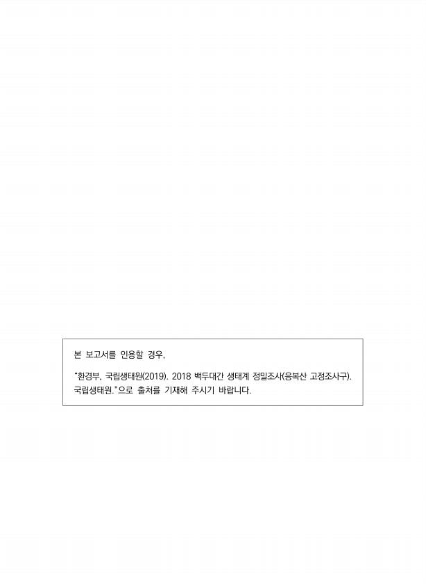 본 보고서를 인용할 경우, “환경부, 국립생태원 2019 2018 백두대간 생태계 정밀조사 응복산 고정조사구 국립생태원.”으로 출처를 기재해 주시기바랍니다.
