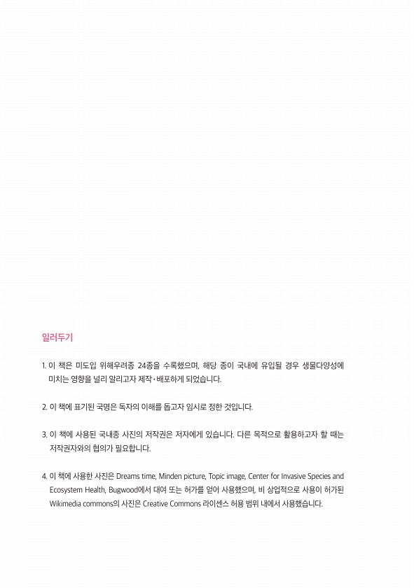 일러두기 1. 이 책은 미도입 위해우려종 24종을 수록했으며, 해당 종이 국내에 유입될 경우 생물다양성에 미치는 영향을 널리 알리고자 제작^배포하게 되었습니다. 2. 이 책에 표기된 국명은 독자의 이해를 돕고자 임시로 정한 것입니다. 3. 이 책에 사용된 국내종 사진의 저작권은 저자에게 있습니다. 다른 목적으로 활용하고자 할 때는 저작권자와의 협의가 필요합니다. 4. 이 책에 사용한 사진은 Dreams time, Minden picture, Topic image, Center for Invasive Species and Ecosystem Health, Bugwood에서 대여 또는 허가를 얻어 사용했으며, 비 상업적으로 사용이 허가된 Wikimedia commons의 사진은 Creative Commons 라이...