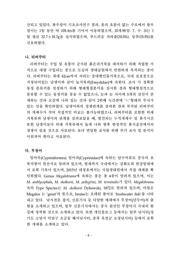 ii 산되고 있었다. 왕우렁이 기초조사연구 결과, 물의 흐름이 없는 수로에서 왕우 렁이는 1일 동안 약 109.4m를 기어서 이동하였으며, 10개체 암7, 수3 는 1 일 평균 32.7±18.7g을 섭식하였으며, 부드러운 자라풀 20.0% , 상추 19.9% 를 선호하였다. 나. 리버쿠터 리버쿠터는 수입 및 유통이 금지된 붉은귀거북을 대처하기 위해 저렴한 가 격으로 대량 수입되는 종으로 도심의 생태공원에서 빈번하게 목격되는 종이 다. 리버쿠터는 최대 42cm까지 자라는 중대형민물거북으로, 국내 보호종으로 지정되어있는 남생이와 같이 늪거북과 Emydidae 에 속한다. 조사 시 정확한 동정 분류키를 설정하기 위해 형태형질분석을 실시한 결과 형태형질적으로 분류할 수 있는 동정키를 찾을 수 없었으나, 눈과 눈 사...
