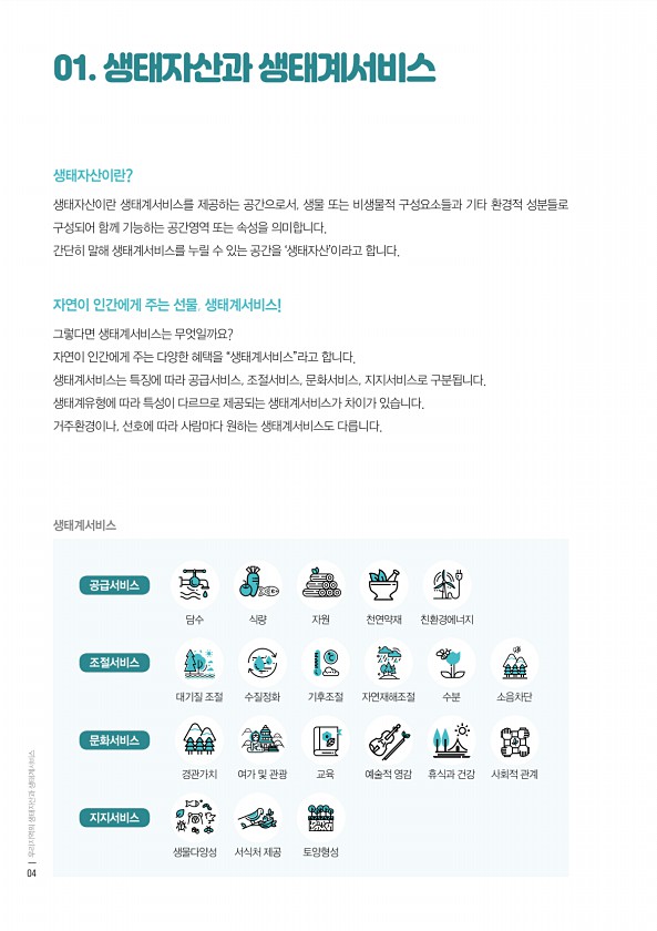 01. 생태자산과 생태계서비스 생태자산이란? 생태자산이란 생태계서비스를 제공하는 공간으로서, 생물 또는 비생물적 구성요소들과 기타 환경적 성분들로 구성되어 함께 기능하는 공간영역 또는 속성을 의미합니다. 간단히 말해 생태계서비스를 누릴 수 있는 공간을 ‘생태자산’이라고 합니다. 자연이 인간에게 주는 선물, 생태계서비스! 그렇다면 생태계서비스는 무엇일까요? 자연이 인간에게 주는 다양한 혜택을 “생태계서비스”라고 합니다. 생태계서비스는 특징에 따라 공급서비스, 조절서비스, 문화서비스, 지지서비스로 구분됩니다. 생태계유형에 따라 특성이 다르므로 제공되는 생태계서비스가 차이가 있습니다. 거주환경이나, 선호에 따라 사람마다 원하는 생태계서비스도 다릅니다. 담수 식량 자원 천연약재 친환경에너지 대기질 조절 수질정화 기...