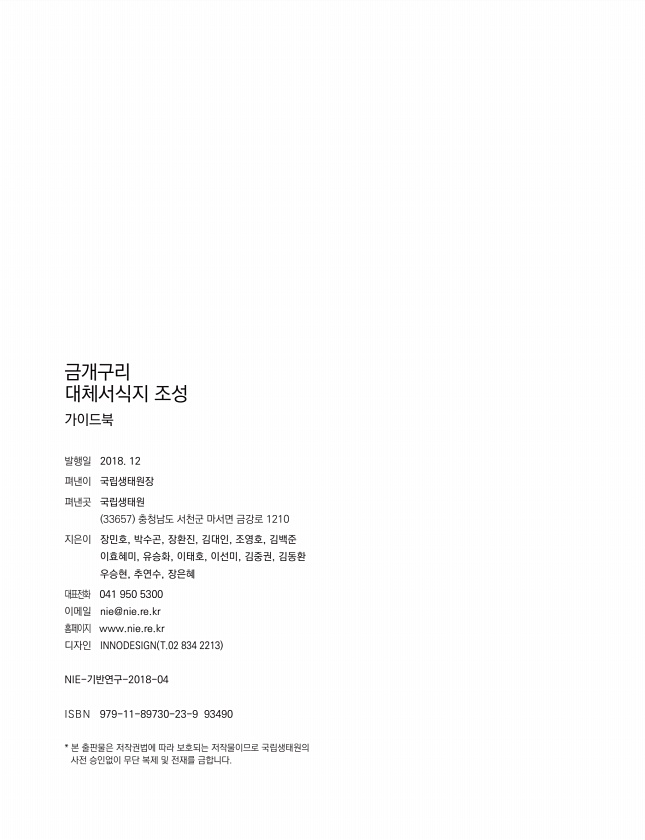 금개구리 대체서식지 조성 가이드북 발행일 2018. 12 펴낸이 국립생태원장 펴낸곳 국립생태원 33657 충청남도 서천군 마서면 금강로 1210 지은이 장민호, 박수곤, 장환진, 김대인, 조영호, 김백준 이효혜미, 유승화, 이태호, 이선미, 김중권, 김동환 우승현, 추연수, 장은혜 대표전화 041 950 5300 이메일 nie@nie.re.kr 홈페이지 www.nie.re.kr 디자인 INNODESIGN T.02 834 2213 NIE-기반연구-2018-04 ISBN 979-11-89730-23-9 93490 * 본 출판물은 저작권법에 따라 보호되는 저작물이므로 국립생태원의 사전 승인없이 무단 복제 및 전재를금합니다.