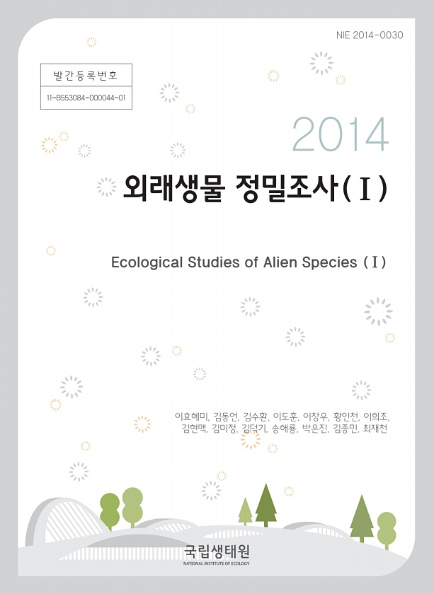 2014 Ecological Studies of Alien Species Ⅰ NIE 2014-0030 발 간 등 록 번 호 11-B553084-000044-01 외래생물 정밀조사 Ⅰ 이효혜미, 김동언, 김수환, 이도훈, 이창우, 황인천, 이희조, 김현맥, 김미정, 김덕기, 송해룡, 박은진, 김종민,최재천