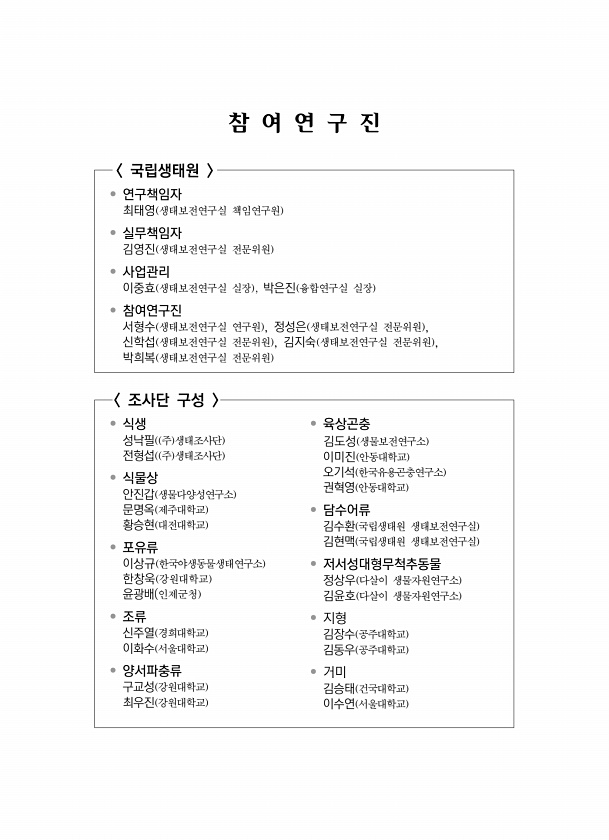 참 여 연 구 진 국립생태원 ? 연구책임자 최태영 생태보전연구실 책임연구원 ? 실무책임자 김영진 생태보전연구실 전문위원 ? 사업관리 이중효 생태보전연구실 실장 , 박은진 융합연구실 실장 ? 참여연구진 서형수 생태보전연구실 연구원 , 정성은 생태보전연구실 전문위원 , 신학섭 생태보전연구실 전문위원 , 김지숙 생태보전연구실 전문위원 , 박희복 생태보전연구실 전문위원 조사단 구성 ? 식생 성낙필 주 생태조사단 전형섭 주 생태조사단 ? 식물상 안진갑 생물다양성연구소 문명옥 제주대학교 황승현 대전대학교 ? 포유류 이상규 한국야생동물생태연구소 한창욱 강원대학교 윤광배 인제군청 ? 조류 신주열 경희대학교 이화수 서울대학교 ? 양서파충류 구교성 강원대학교 최우진 강원대학교 ? 육상곤충 김도성 생물보전연구소 이미진 안동대학...