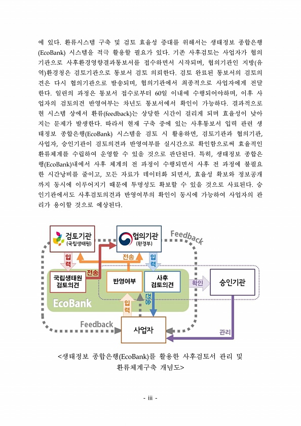 에 있다 환류시스템 구축 및 검토 효율성 증대를 위해서는 생태정보 종합은행 시스템을 적극 활용할 필요가 있다 기존 사후검토는 사업자가 협의 기관으로 사후환경영향결과통보서를 접수하면서 시작되며 협의기관인 지방 유 역 환경청은 검토기관으로 통보서 검토 의뢰한다 검토 완료된 통보서의 검토의 견은 다시 협의기관으로 발송되며 협의기관에서 최종적으로 사업자에게 전달 한다 일련의 과정은 통보서 접수로부터 일 이내에 수행되어야하며 이후 사 업자의 검토의견 반영여부는 차년도 통보서에서 확인이 가능하다 결과적으로 현 시스템 상에서 환류 는 상당한 시간이 걸리게 되며 효율성이 낮아 지는 문제가 발생한다 따라서 현재 구축 중에 있는 사후통보서 입력 관련 생 태정보 종합은행 시스템을 검토 시 활용하면 검토기관과 협의기관 사업자 승...