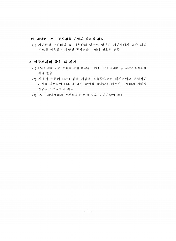 iii 마. 개발된 LMO 동시검출 기법의 실효성 검증 1 자연환경 모니터링 및 사후관리 연구로 얻어진 자연생태계 유출 의심 시료를 이용하여 개발된 동시검출 기법의 실효성 검증 5. 연구결과의 활용 및 제언 1 LMO 검출 기법 보유를 통한 환경부 LMO 안전관리계획 및 세부시행계획에 적극 활용 2 세계적 수준의 LMO 검출 기법을 보유함으로써 체계적이고 과학적인 근거를 확보하여 LMO에 대한 국민적 불안감을 해소하고 생태계 위해성 연구의 기초자료를 제공 3 LMO 자연생태계 안전관리를 위한 사후 모니터링에활용