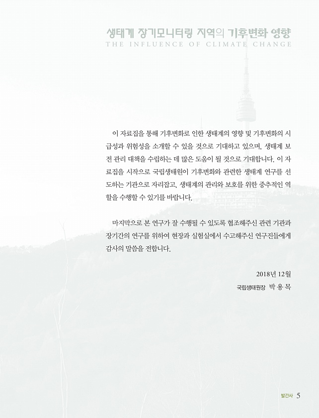 이 자료집을 통해 기후변화로 인한 생태계의 영향 및 기후변화의 시 급성과 위험성을 소개할 수 있을 것으로 기대하고 있으며, 생태계 보 전 관리 대책을 수립하는 데 많은 도움이 될 것으로 기대합니다. 이 자 료집을 시작으로 국립생태원이 기후변화와 관련한 생태계 연구를 선 도하는 기관으로 자리잡고, 생태계의 관리와 보호를 위한 중추적인 역 할을 수행할 수 있기를 바랍니다. 마지막으로 본 연구가 잘 수행될 수 있도록 협조해주신 관련 기관과 장기간의 연구를 위하여 현장과 실험실에서 수고해주신 연구진들에게 감사의 말씀을 전합니다. 2018년 12월 국립생태원장 박 용 목 생태계 장기모니터링 지역의 기후변화 영향 T H E I N F L U E N C E O F C L I M A T E C H A N G E 발간사5