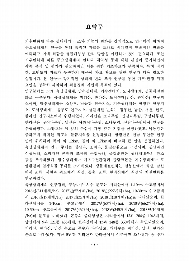 i 요약문 기후변화에 따른 생태계의 구조와 기능의 변화를 장기적으로 연구하기 위하여 주요생태계의 연구를 통해 축적된 자료를 토대로 시계열적 연속적인 변화를 예측하고 이에 적합한 생물다양성 관리 방안을 마련하는 것이 필요하다. 또한 기후변화에 따른 주요생태계의 변화와 취약성 등에 대한 관심이 증가하면서 각종 분석 및 평가가 필요하지만 이를 위한 기초자료가 부족하다. 특히 장기 간, 고빈도의 자료가 부족하기 때문에 자료 확보를 위한 연구가 더욱 필요한 실정이다. 본 연구는 장기적인 생태계 변화 조사 연구를 통한 기후·환경 위협 요인을 명확히 파악하여 적응정책 지원에 목적이 있다. 연구분야는 크게 육상생태계, 담수생태계, 기수생태계, 도서생태계, 생물계절변 화로 구분된다. 육상생태계는 지리산, 한라산, 도시생태 ...