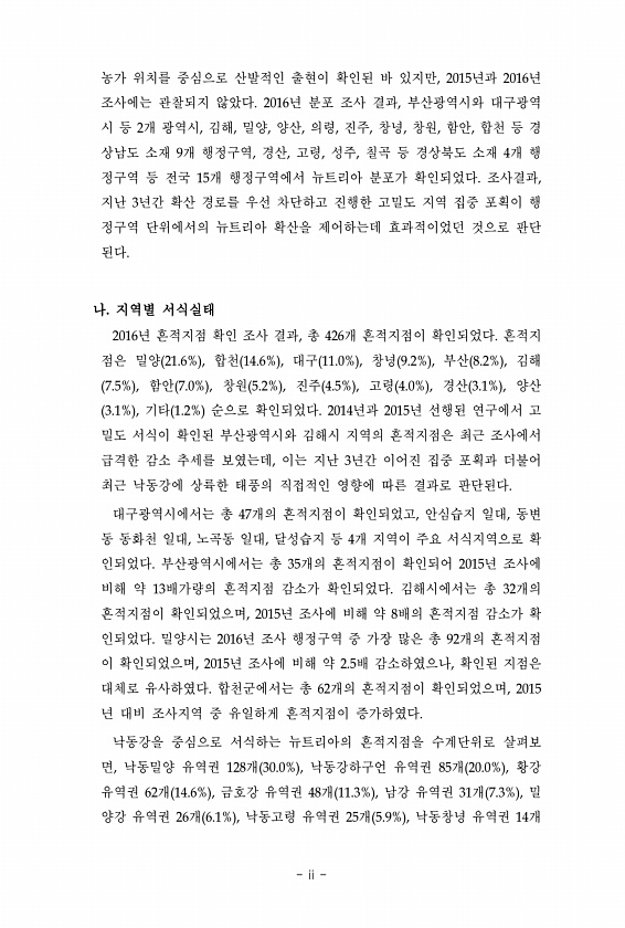 농가 위치를 중심으로 산발적인 출현이 확인된 바 있지만, 2015년과 2016년 조사에는 관찰되지 않았다. 2016년 분포 조사 결과, 부산광역시와 대구광역 시 등 2개 광역시, 김해, 밀양, 양산, 의령, 진주, 창녕, 창원, 함안, 합천 등 경 상남도 소재 9개 행정구역, 경산, 고령, 성주, 칠곡 등 경상북도 소재 4개 행 정구역 등 전국 15개 행정구역에서 뉴트리아 분포가 확인되었다. 조사결과, 지난 3년간 확산 경로를 우선 차단하고 진행한 고밀도 지역 집중 포획이 행 정구역 단위에서의 뉴트리아 확산을 제어하는데 효과적이었던 것으로 판단 된다. 나. 지역별 서식실태 2016년 흔적지점 확인 조사 결과, 총 426개 흔적지점이 확인되었다. 흔적지 점은 밀양 21.6% , 합천 14.6% , 대구 11....