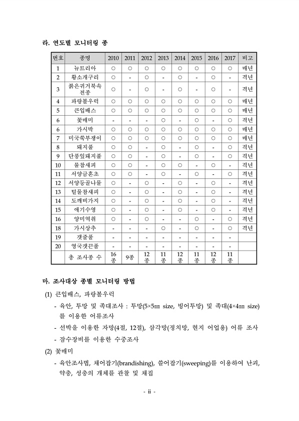 ii 라. 연도별 모니터링 종 번호 종명 2010 2011 2012 2013 2014 2015 2016 2017 비고 1 뉴트리아 ○ ○ ○ ○ ○ ○ ○ ○ 매년 2 황소개구리 ○ ○ ○ ○ 격년 3 붉은귀거북속 전종 ○ ○ ○ ○ 격년 4 파랑볼우럭 ○ ○ ○ ○ ○ ○ ○ ○ 매년 5 큰입배스 ○ ○ ○ ○ ○ ○ ○ ○ 매년 6 꽃매미 ○ ○ ○ 격년 6 가시박 ○ ○ ○ ○ ○ ○ ○ ○ 매년 7 미국쑥부쟁이 ○ ○ ○ ○ ○ ○ ○ ○ 매년 8 돼지풀 ○ ○ ○ ○ ○ 격년 9 단풍잎돼지풀 ○ ○ ○ ○ ○ 격년 10 물참새피 ○ ○ ○ ○ ○ 격년 11 서양금혼초 ○ ○ ○ ○ ○ 격년 12 서양등골나물 ○ ○ ○ ○ 격년 13 털물참새피 ○ ○ ○ ○ 격년 14 도깨비가지 ○ ○ ○ ○ 격년 ...