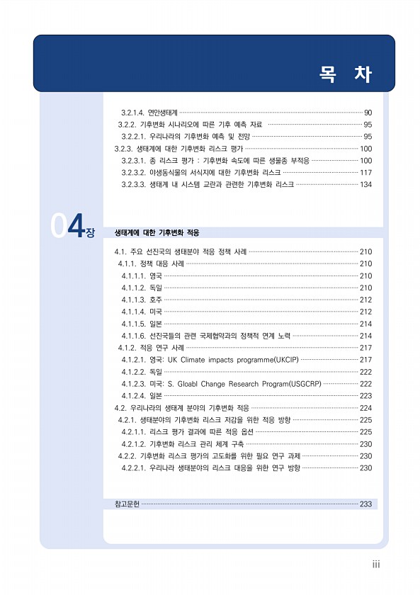 iii 목 차 3.2.1.4. 연안생태계 ········································································································ 90 3.2.2. 기후변화 시나리오에 따른 기후 예측 자료 ····················································· 95 3.2.2.1. 우리나라의 기후변화 예측 및 전망 ······························································ 95 3.2.3. 생태계에 대한 기후변화 리스크 평가 ·····························································...